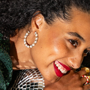 Get ready to add some alpine-inspired glamour to your look with our stunning Zoey Stripes Small Beaded Hoop Earrings in St. Moritz colors! These earrings are the perfect accessory to elevate any outfit with a touch of chic winter charm.