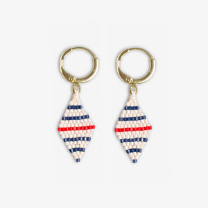 Dive into style with the Carmen Mini Gold Hoop Single Horizontal Stripes Beaded Drop Earrings in Navy, inspired by the chic spirit of St. Tropez. Crafted from 80% Glass and 20% Brass Metal, these earrings feature single horizontal stripes in ivory, navy, and poppy. Carmen is the perfect accessory for those who want to infuse their look with nautical sophistication.