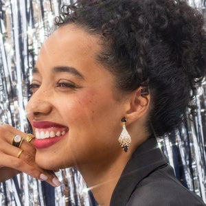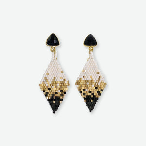 Introducing Sky, the earrings that are about to take your accessory game to new heights! These small diamond drop earrings with semi-precious stone posts are here to add a touch of elegance and intrigue to your look. Picture this: you're getting ready for a sophisticated soirée, and you need a pair of earrings that are as mysterious as the night sky. Enter Sky, with her captivating combination of sleek black and shimmering gold.