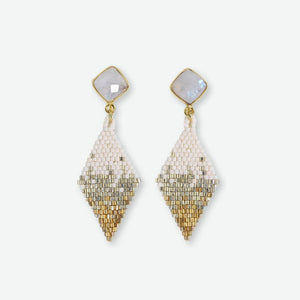 Introducing Sky, the earrings that are about to take your accessory game to new heights! These small diamond drop earrings with semi-precious stone posts are here to add a touch of elegance and intrigue to your look. Picture this: you're getting ready for a sophisticated soirée, and you need a pair of earrings that are as mysterious as the night sky. Enter Sky, with her captivating combination of shimmering gold and silver. The diamond-shaped beaded design creates a mesmerizing pattern that's sure to draw admiring glances from across the room.