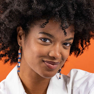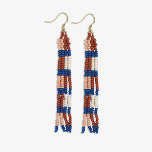 Get ready to embrace the spirit of the desert with our June Checks and Stripes Petite Beaded Fringe Earrings. Designed with the signature INK+ALLOY creative touch, these hanger earrings feature a dreamy desert design with a delightful combination of rust red, blush, and blue seed beads. The intricate geometric pattern adds a touch of free-spirited charm to your ensemble, while the skinny silhouette and delicate, short fringe create a subtle and elegant look.