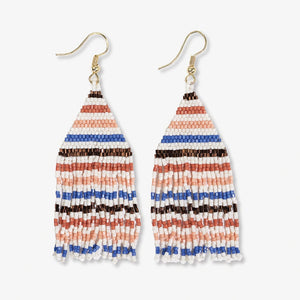 Embrace the Sedona Sunset style with the Luxe Lexie Horizontal Lines Beaded Fringe Earrings in rust + lapis blue. These fringe earrings feature a modern boho design that captures the essence of the desert sunset. The silvery, glistening beads and the sparkle of the design add a touch of glamour and elegance. With a length of 3.20" and a width of 1.04", these fringe earrings are a perfect accessory for those who want to embrace a free-spirited and artistic style.