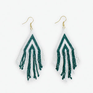 Cheer on your team in style with the Haley Game Day Stacked Triangle Beaded Fringe Earrings. These shoulder-dusting earrings feature layered triangle shapes strung with hunter green and crisp white seed beads in a bold colorblocked design. Tiers of beaded fringe dangle below, swaying gracefully with every movement.