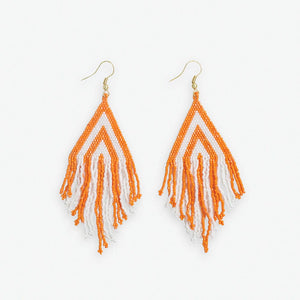 Cheer on your team in style with the Haley Game Day Stacked Triangle Beaded Fringe Earrings. These shoulder-dusting earrings feature layered triangle shapes strung with bright orange and crisp white seed beads in a bold colorblocked design. Tiers of beaded fringe dangle below, swaying gracefully with every movement.
