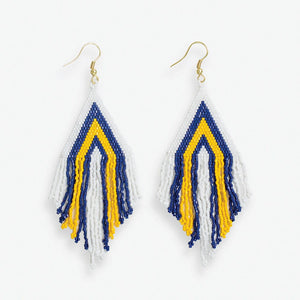 Cheer on your team in style with the Haley Game Day Stacked Triangle Beaded Fringe Earrings. These shoulder-dusting earrings feature layered triangle shapes strung with yellow, navy, and crisp white seed beads in a bold colorblocked design. Tiers of beaded fringe dangle below, swaying gracefully with every movement.