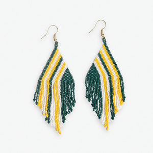 Cheer on your team in style with the Haley Game Day Stacked Triangle Beaded Fringe Earrings. These shoulder-dusting earrings feature layered triangle shapes strung with green and yellow seed beads in a bold colorblocked design. Tiers of beaded fringe dangle below, swaying gracefully with every movement.