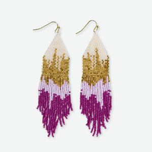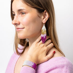 A must for those who love their everyday delicates with a touch of evening elegance. These magenta, light pink, and gold ombre earrings are handwoven with an effortless shimmer to easily elevate any look! As lively as they are luxurious, these boho-chic earrings capture the fierce yet laid-back essence of the modern bohemian babe. The ombre fade effect lends an irresistible vintage-inspired vibe that complements the carefree spirit of the fringe design.