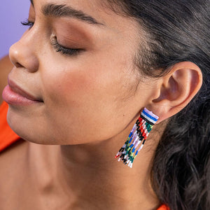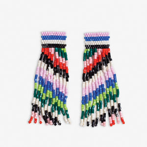 Embrace the spirit of Rio with our Luxe Marilyn Diagonal Stripes Beaded Fringe Earrings. Featuring light lavender, royal blue, ivory, black, bright green, bright emerald, poppy, and pink, these earrings are crafted from shimmery glass beads. The diagonal stripes add a dynamic touch, making them the perfect addition to your jewelry box.