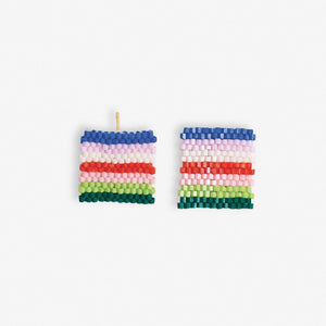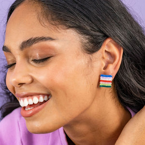 Introducing the Kallie Horizontal Stripes Rectangle Post Beaded Earrings from our Luxe Collection. With royal blue, light lavender, ivory, poppy, pink, bright green, and bright emerald, these earrings capture the essence of Rio.