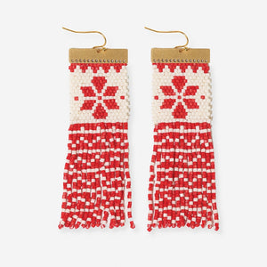 Add a festive touch of sparkle and movement to your holiday looks with the charming Lauren Holiday Beaded Fringe Earrings in red. Meticulously handcrafted, each earring features a brushed brass rectangular connector suspending delicate strands of shimmering red and white glass beads. The beads are precisely arranged in an eye-catching geometric pattern, creating a refreshingly modern twist on classic beaded fringe designs. Lightweight and comfortable for all-day wear, these statement earrings effortlessly elevate any ensemble with their lively movement and joyful color. The bright red hue evokes the beauty of classic holiday cheer, while the crisp white adds a pop of frosty contrast. Pair these versatile beaded baubles with your favorite cocktail dress for a holiday soirée, or let them add a dose of cheer to a cozy sweater and jeans look. At 3" long, they provide just the right amount of drama without overwhelming your look.