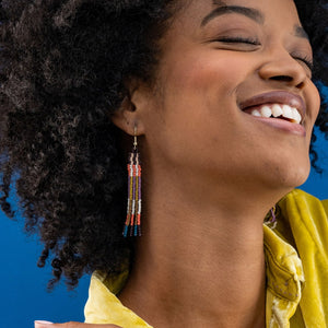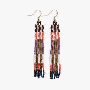 Get ready to make a bold and vibrant statement with the Melissa Alternating Two Color Grids Petite Beaded Fringe Earrings. These hanger earrings feature a stunning combination of purple, citron, and coral seed beads, creating an in-your-face colorway that is sure to catch everyone's attention. With subtle metallic accents adding a touch of sophistication, these earrings showcase a multi-color striped design in a modern geometric pattern. Measuring 3.25" in length and 0.43" in width, they offer the perfect balance of style and comfort.