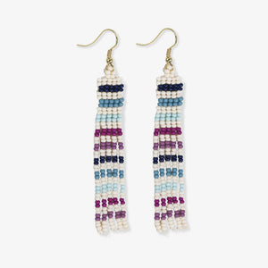 For a cool and serene vibe, choose the Melissa Horizontal Stripes Petite Beaded Fringe Earrings in purple, blue, and cream seed beads. These hanger earrings feature icy-cool, pacific, and frosty colors that evoke a calming and soothing ambiance. With their 3.25" length and 0.43" width, these fringe earrings add a touch of tranquility and elegance to your look. Let the peaceful colors of these earrings inspire a sense of serenity wherever you go.