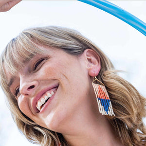 Modern design fanatics, festival-goers + board room bosses, these seed bead fringe earrings are for you! Our diamond-patterned earrings are turning heads across a multitude of style trends. These blush, orange, blue + cream beauties will be your new go-to statement makers.