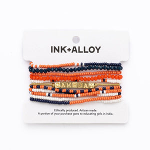 Show your team spirit with our curated Game Day bracelet stack. It features 10 strands of seed bead bracelets and a brass friendship bracelet sporting the word "GAMEDAY".