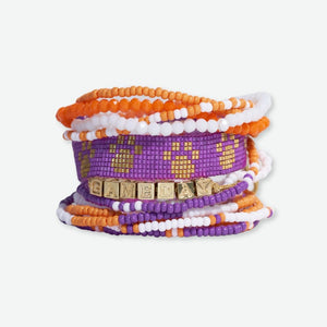 Show your team spirit with our curated Game Day bracelet stack. It features 10 strands of seed bead bracelets and a brass friendship bracelet sporting the word "GAMEDAY"