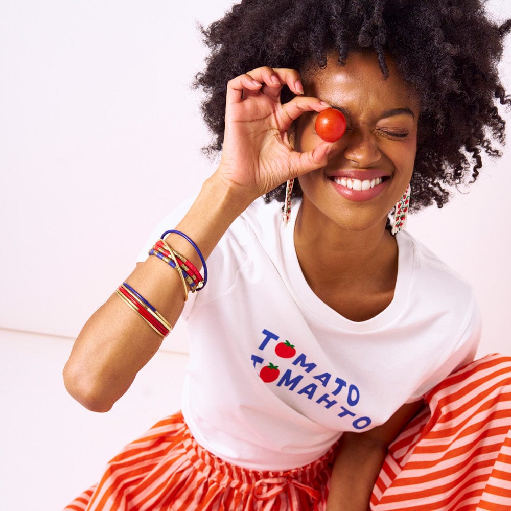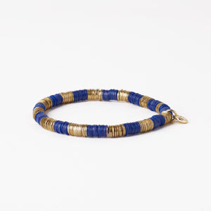 • Alternating lapis-toned beads finished with gold sequin details
