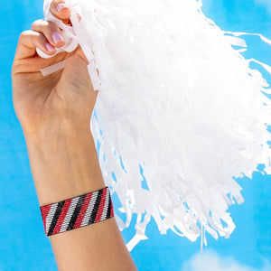 Whether you're cheering in the stands or enjoying a celebratory brunch, the Kenzie Diagonal Stripes Bracelet lends spirited flair to elevate your game day outfit. The classic scarlet red and black palette gets an eclectic upgrade from the beaded texture and striped motif. Handcrafted with exceptional quality, this beaded stretch bracelet allows you to showcase team pride with style.