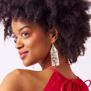 • Beaded fringe earrings with floral motifs in a rainbow palette • Hand-beaded design with easy movement • Adds instant joy to everyday outfits