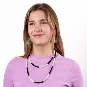 • Long strand necklace with black & white glass bead pattern • Lightweight seed beads with easy drape • Wear long or doubled for a layered look