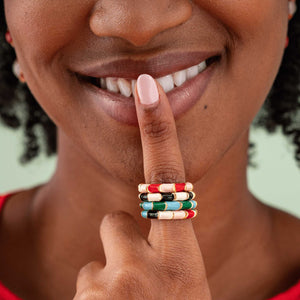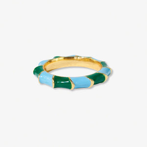 Elevate your look with the Paisley Twisted Colorblock Enamel Ring in green and light blue. This brass and enamel cocktail ring showcases a twisting design with color-blocked stripes, offering a modern and trendy aesthetic. The combination of green and light blue hues adds a refreshing and stylish touch to your outfit. Pair it with the Pippa Earrings for a coordinated and fashion-forward ensemble.