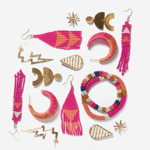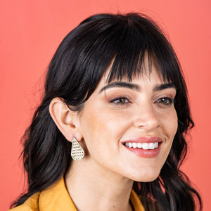 Like dainty dew drops, the sleek design of these statement earrings is subtle, yet breathtaking. Precision-cut glass Luxe beads have been carefully handmade into a horizontal stripe pattern that feels modern + boho. Ivory + gold beads are encircled by brass to create your new favorite everyday post earrings. From brunch with friends to date night, these bold beauties have you covered.