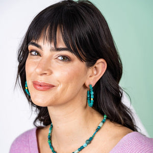 A classic shape with a whole new take. Hoop, there it is! Join in the fun of our Gen-Z-inspired Kaleidoscope collection and let the joy of color take you back to simpler times. Our funky fun mismatched glass beads create a statement that is both modern + groovy. Green + yellow beads in varying sizes create a pattern that is eye-catching and effortlessly cool. Life is short - buy the statement hoops.