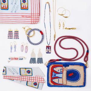 • Hand-beaded navy and ivory stripes with a pop of rich red