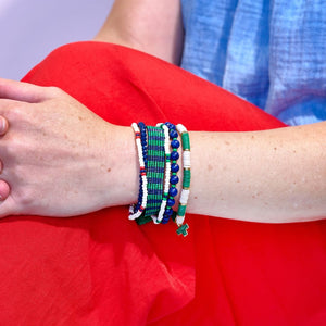Crafted for the free-spirited goddess who craves variety, this stack is a playful fusion of materials that'll have you floating on a bohemian breeze. Immerse yourself in the deep richness of navy blues, reminiscent of the starlit midnight sky, harmonizing effortlessly with the energetic pops of kelly green.