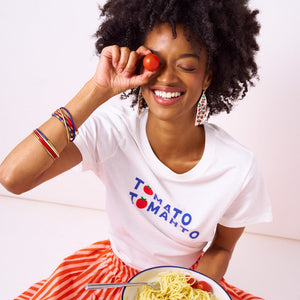 • Statement fringe earrings featuring playful tomato-inspired beadwork