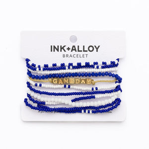 Show your team spirit with our curated Game Day bracelet stack. It features 10 strands of seed bead bracelets and a brass friendship bracelet sporting the word "GAMEDAY".