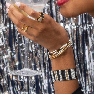Add a touch of modern sophistication to your wrist with the Kenzie Vertical Stripes Beaded Stretch Bracelet in black and white. This chic accessory features a bold, graphic design that effortlessly combines contrasting black and white seed beads in a striking vertical stripe pattern. Meticulously handcrafted, the Kenzie bracelet showcases the skill and attention to detail of our talented artisans.