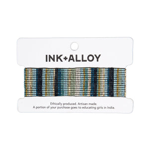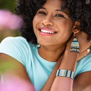Style tip: Cool shades of blue with pops of metallic gold beads have us dreaming of ocean waves kissed by the sun. Grab your go-to denim jacket for a monochromatic look, or your favorite coral-colored top for maximum complimentary color goodness.