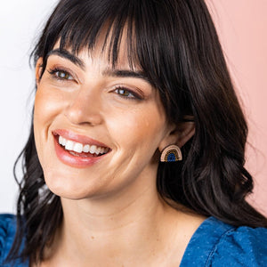Post earrings for the win! We've taken our signature glass seed beads and given them a whole new look. Perfect for everyday wear, these colorful cuties are the subtle statement earrings you'll reach for time and time again. Blush pink, gold, and lapis blue beads are handwoven in rows to bring this boho rainbow to life. What better way to add a pop of positivity to your look?